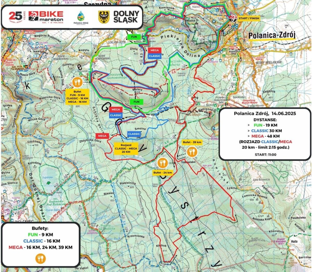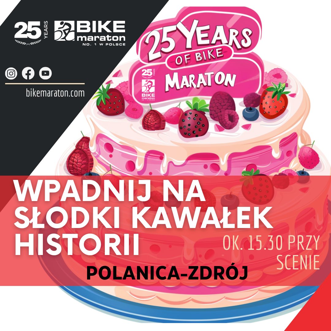 Organizatorzy cyklu Bike Maraton zapraszają na kolejną edycję cyklu – 14 czerwca spotykamy się w Polanicy-Zdroju – jednym z symboli Bike Maratonu i polskiego MTB. To miejsce, które jest częścią cyklu od samego początku – od dwudziestu pięciu lat. I właśnie do Polanicy zapraszamy teraz na wyjątkowy kolarski poczęstunek – w trakcie dekoracji zwycięzców będziemy kroić, dzielić i raczyć się pysznym urodzinowym tortem. Zapewniamy – słodkości starczy dla wszystkich!