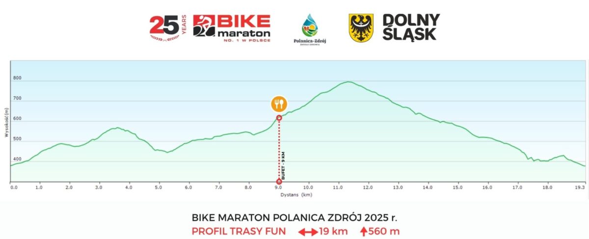 Najkrótszy dystans Bike Maratonu (FUN) będzie miał w Polanicy 19 km i przewyższenie 560 m. Po pierwszych sześciu kilometrach FUN odłączy się od pozostałych dystansów i podąży własnymi wygodnymi i bezpiecznymi leśnymi drogami. Końcówka – jak zawsze w Polanicy-Zdroju – zjazd, uważajmy więc do samego końca!