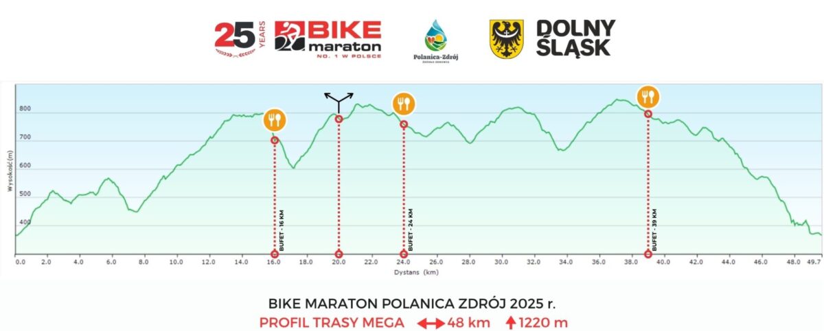 MEGA będzie pewnie pięknym nawiązaniem do historii maratonów MTB – prawie 50 km i ponad 1200 m w pionie. Nie ma się co dziwić, że przewyższenie jest spore, bo zawodnicy dwukrotnie zjadą do doliny Bystrzycy, ale będą też oczywiście przemierzać najwyżej położone okolice. Na koniec Piekielna Góra i zjazd do mety. Tu zawsze jest gdzie jeździć!