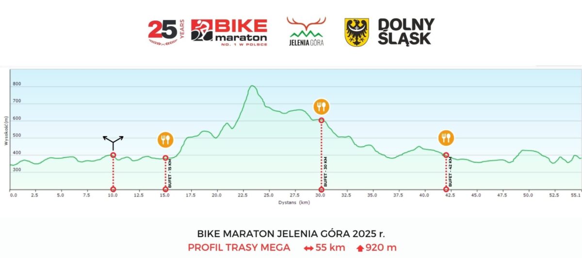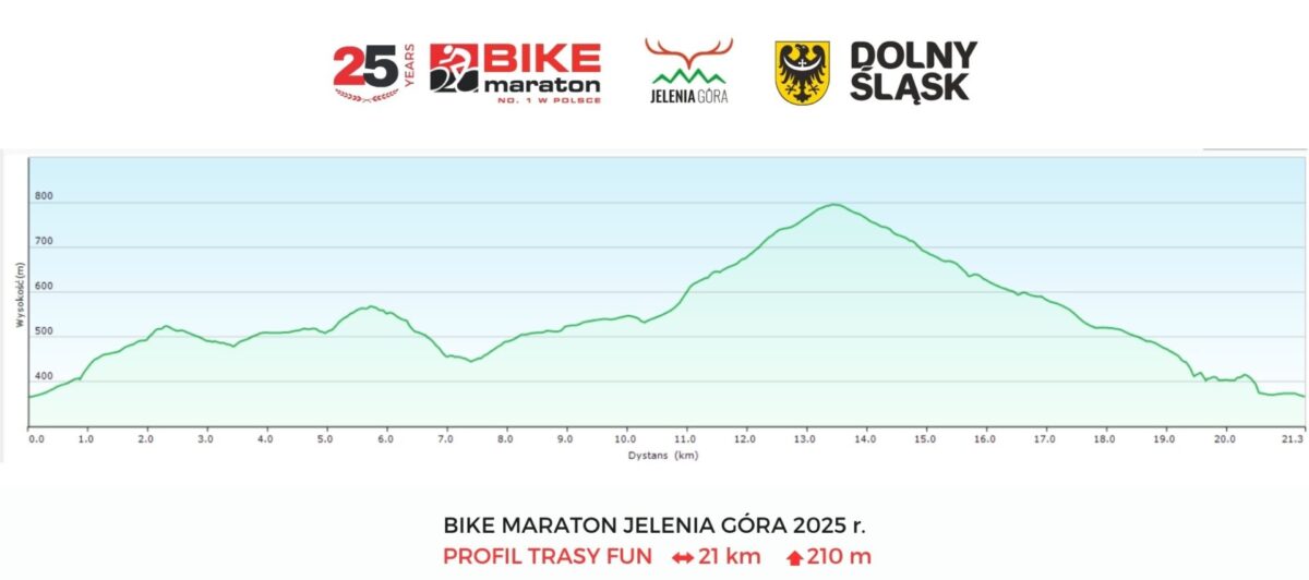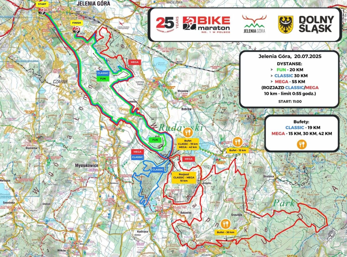 Trasa wyprowadzi kolarzy w malownicze Rudawy Janowickie i zaserwuje 20 km na dystansie FUN (jeśli ktoś chce rozpocząć przygodę z Bike Maratonem lub spróbować swoich sił na krótkiej trasie – jeleniogórski FUN będzie idealny!), 30 km na dystansie CLASSIC (tu już będzie trochę techniki i górek, choć wszystko nadal utrzymane w tonie dostępności i przyjemności z jazdy) i 55 km na dystansie MEGA (tu przewyższenie sięgną 1000 m w pionie!).