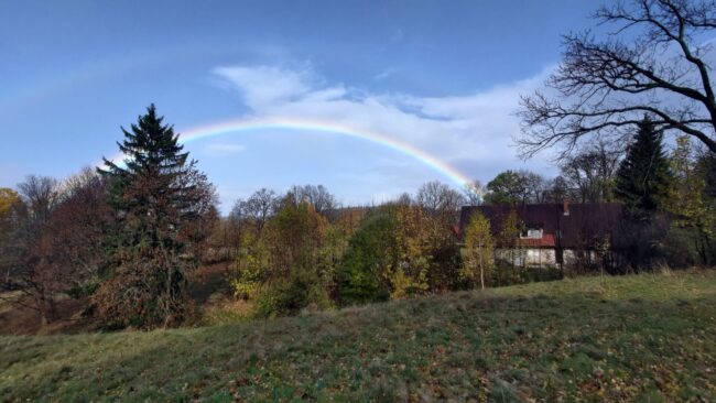 Fragmentami Rowerowych Olbrzymów wyjechaliśmy na górę, skąd poprowadzeni zostaliśmy specjalnie przygotowanymi i posprzątanymi na Zlot trasami enduro. Po drodze towarzyszył nam deszcz, wiatr, śnieg, ale była też tęcza, której początek dane mi było zobaczyć po raz pierwszy. Niby na wyciągnięcie ręki, ale niestety nie było ani skrzata ani tym bardziej garnka ze złotem. Było za to dużo rozmów na podjazdach i postojach oraz dużo zabawy na zjazdach.